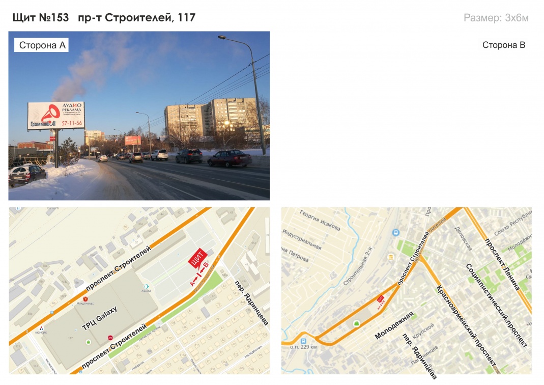 Рекламная конструкция установлена на одном из основных проспектов города. Направление транспортного потока – центр города, авто и железнодорожный вокзал. Расположен на рядом с парковочной зоной ТРЦ Галактика.