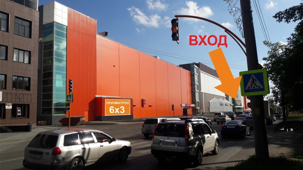 Конструкция установлена на одном из основных проспектов города на оживленном перекрестке. Место скопления автомобильной пробки. Щит расположен на территории крупного торгово-офисного центра. Поблизости расположены различные многопрофильные компании, торговый комплекс Знак. Рекламная плоскость направлена на большой транспортный поток, движущийся по проспекту Строителей из центра города на Павловский тракт.